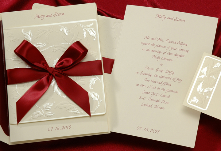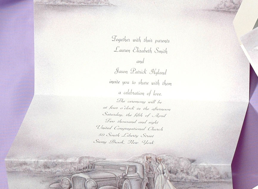 Custom designs also created to match your imagination. Weber Printing has printed custom self-folding invitations, scrolls that are mailed out in tubes, translucent velum overlays and multi layered invitations you can assemble by tying with ribbon or anything you can conceive. Please email or call to discuss a custom designed wedding invitation.